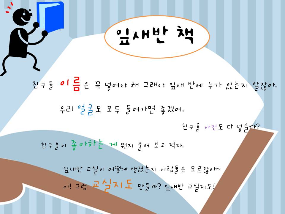 - 잎새반 친구들 이름이 다 들어있어야 해요. 그래야지 사람들이 책 보면 잎새반에 누가 있는지 알지요.