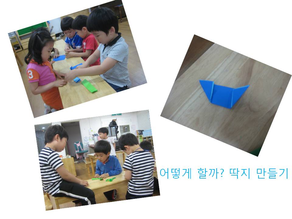많이 자르지도 않았고 완성된 종이를 보며, 두 개의 색종이도 조심스럽게 겹쳐 보았습니다. 그러나 이번에도 색종이 딱지는 접히지 않습니다.‘왜 안되지?’ 고민에 빠집니다. 그러다 친구 한명이 무엇인가 발견한 듯 소리 칩니다. ‘색종이 끝을 반대로 접는거다~’ ‘반대로 접으니깐 된다’ 완성된 색종이 딱지를 만들어 온 친구 한명이 다른 친구들에게 다가옵니다. ‘여기를 똑같이 접으니깐 안되지~’ ‘여기는 반대로 접는거다’ 딱지 접는 방법을 설명해 줍니다.