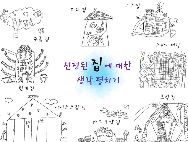 <어린이가 꿈꾸는 집>을 공동으로 구성하기 위해 친구들이 그린 다양한 집 중에서 8개의 집을 선정합니다. 다수결에 따라 선정된 하트집, 번개집, 우주경찰집, 보석집, 스파이더집, 구름집, 아이스크림 집, 과자집. 어린이들은 8개의 집 중 자신이 표현하고 싶은 집을 선정하여 친구와 팀을 구성합니다. 그리고 선정한 집을 어떻게 표현할지 자신의 생각을 그림 속에 담아봅니다. “구름집을 만들면 폭신폭신하고 구름 안에 몰래 숨을 수 있을 것 같아서 재미있을 것 같아요.” “우주에 있으면 달과 별도 가까이서 볼 수 있고, 경찰들이 어린이들을 보호해 줘서 안전할 것 같아요.”“집을 하트 모양으로 만들면 예뻐서 친구들과 새들도 많이 놀러올 것 같아요.” “과자집에서 살면 엄마한테 과자 사달라고 조르지 않아도 과자를 마음껏 먹을 수 있어 좋을 것 같아요.” “보석집은 보석이 반짝반짝 빛나서 밤 늦게까지 어린이들이 놀 수 있어 좋을 것 같아요.” “아이스크림집은 차가워서 녹지 않는 아이스크림을 언제든지 먹을 수 있도록 만들면 좋을 것 같아요” “스파이더 집을 만들면 나쁜 사람을 스파이더 줄로 막아서 어린이들을 보호할 수 있을 것 같아요.” “번개 집은 나쁜 사람을 번개로 막아내서 어린이들을 보호해줄 수 있을 것 같아요.” 어린이들은 자신이 표현하고 싶은 집을 그림으로 표상하며 어떤 생각들을 담아낼지 구체적으로 생각하게 됩니다. 이러한 생각을 친구와 함께 나누면서 그림은 또 다시 어떻게 변화하게 될까요?<반쪽이의 상상력 박물관>