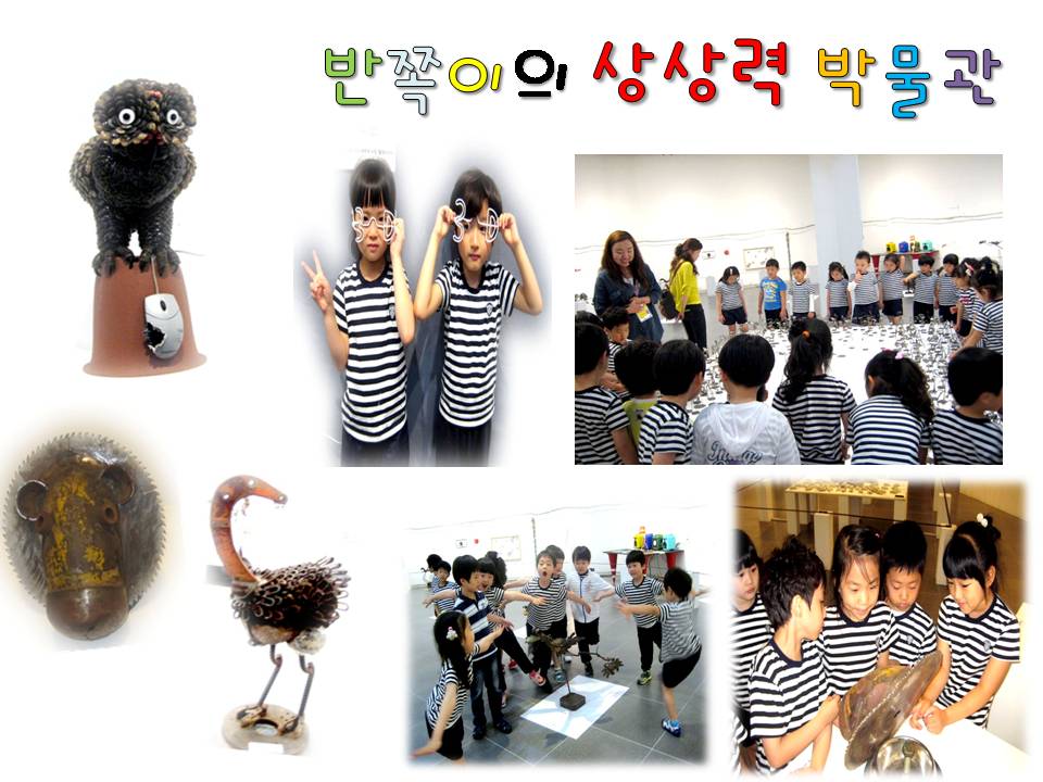 햇살반 친구들과 함께 대구 문화 예술회관에 열리는 반쪽이의 상상력 박물관에 다녀왔답니다. 그 곳에는 오토바이 부품으로 만든 독수리, 솥뚜껑으로 만든 거북이, 소화기로 만든 펭귄, 전구로 만든 파리 등 흔히 쓰레기로 버리는 폐물을 이용해 만든 동·식물 등 신기하고 재미있는 다양한 조형예술작품들이 가득 전시되어 있었답니다. “화장실에 신는 슬리퍼가 카멜레온으로 변신되었어!” “박쥐 봐! 마우스와 우산으로 만들었대!” “주전자로 만든 닭! 닭이 불에 익은 것 같아~”