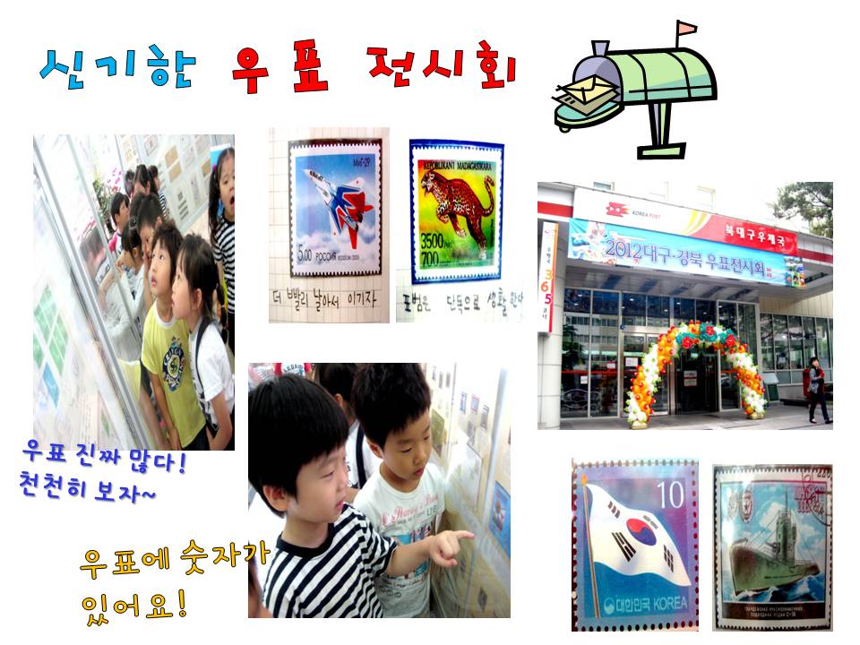 “옷걸이로 재미있는 안경을 만들 수 있다는게 신기해요! 저도 집에서 옷걸이로 안경을 만들어 보고 싶어요.” 가정에서도 친구들과도 버려진 고물을 이용하여 기발하고 재미있는 상상력을 펼쳐 보시면 어떨까요?<우표 전시회> 북대구 우체국에 열린 우표 전시회에 다녀왔어요. 우체부 아저씨를 통해 우편물이 배달되는 과정에 대한 소개를 들은 후, 다양하게 디자인된 우표들을 감상하며 아름다움을 느낍니다. “내가 좋아하는 제트기가 그려진 우표도 있어요!”“우리나라에서 만든 우표라서 대한민국이라 적혀 있나 봐요.”“우표에 도장도 찍혀 있어요. 우리 동네에 온 편지라는 것을 표시하는 건가?”“우표에 숫자는 왜 있지? 가격을 표시하는 건가?”“우표를 만든 날짜 같은데...”“우표 가격은 왜 다 다르지?”“예쁠수록 더 비싼 게 아닐까?” “왜 편지 봉투에 우표를 붙여야 하는 걸까?”“진짜 편지인지 가짜 편지인지 구분하기 위해서?”“ 편지봉투를 더 예쁘게 꾸미기 위해서?”우표 전시회 관람을 통해 우표의 구성요소와 기능에 대해서도 관심을 가질 수 있었답니다.