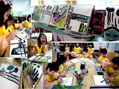 먹이라는 새로운 재료는 어린이들의 호기심을 불러오기에 충분합니다. 붓을 누르고 들어 올리고에 따라 달라지는 선의 굵기를 탐색하고 거칠거나 부드러운 선의 변화에 민감하게 반응합니다.