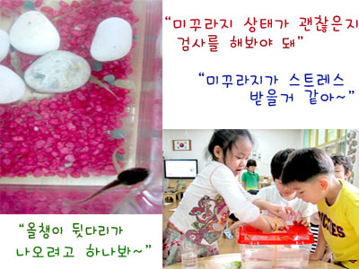 이슬반 친구들은 살아있는 동물들에게 관심이 많답니다. 이슬반에는 개구리, 미꾸라지, 올챙이가 살고 있어요. 바깥놀이터에서 개미를 잡아서 개미 놀이터도 만들어 주고 개미 수영장도 만들어주던 이슬반 친구들이 이번에는 교실에 직접 가지고 와 관찰을 하면서 살아있는 것에 대한 관심을 키우고 있습니다.