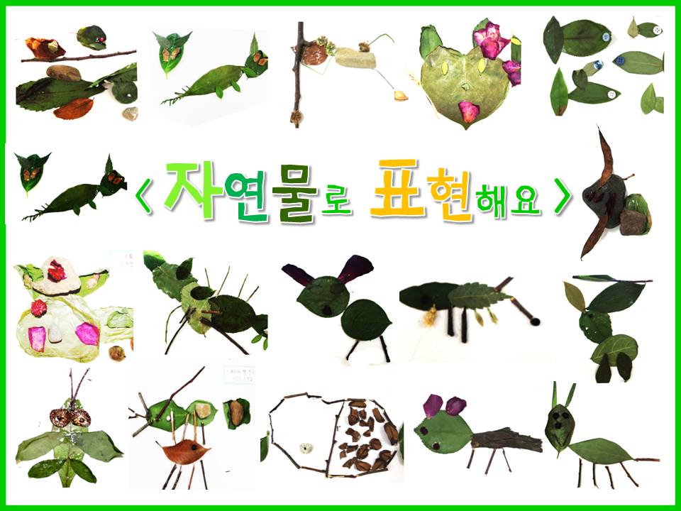 친구와 이야기 나누고 협동하며 좋아하는 동물을 뚝딱뚝딱 표현해보고 작품에 가장 어울리는 이름도 정해주었답니다. 서로의 작품을 이야기 나누고, 교실 창가에 전시하여 유아들과 작품을 감상하여 봅니다. 자연물을 관찰하고 꾸며보는 활동을 통해 자연을 이해하고 친숙해지는 기회가 되었답니다.