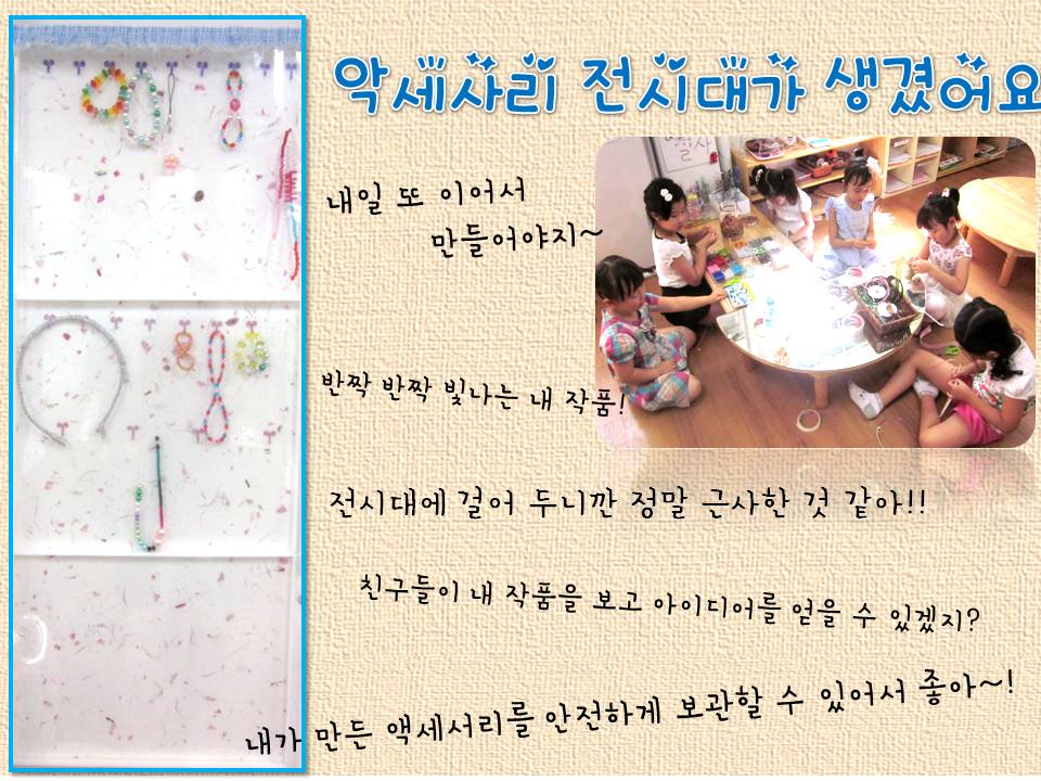 이제 만든 악세사리를 교사가 지원한 전시대에 전시해 봅니다. 전시대에서 빛나는 멋진 악세사리를 통해 다른 유아들도 관심을 가집니다. 계속되는 악세사리 다음 이야기 기대해주세요.