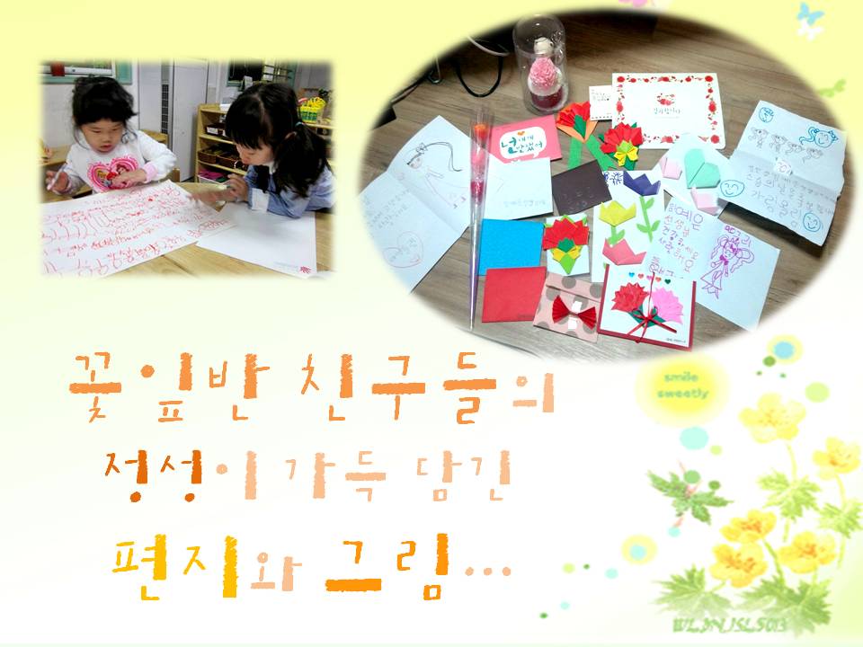 아이들은 편지지에 선생님에게 하고 싶은 말을 적고, 선생님의 얼굴을 관찰하며 선생님의 얼굴을 그려봅니다. 그리고 정성을 가득 담은 편지를 수줍게 선생님께 내밉니다. 아이들의 편지에 하루 종일 행복한 선생님은 보답으로 <선생님은 천사>라는 노래로 아이들에게 노래 선물을 합니다. 꽃잎반 천사들아 사랑해요~