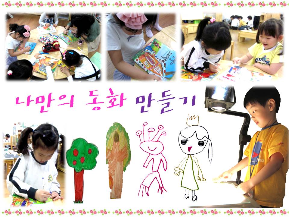 “우리 공주님, 왕자님이 나오는 이야기를 만들자”“난 도깨비를 좋아해서 도깨비 역할을 하고 싶어”“난 귀여운 토끼역할을 하고 싶어....”“그럼 공주님과 왕자님이 숲 속에서 토끼와 도깨비를 만나면 되겠다.” 아이들이 서로 토론하는 과정을 통해 등장인물, 배경, 멋진 줄거리를 구성해냅니다. “난 그림을 잘 그리니까 배경을 그릴래”“난 공주님을 그릴래.” OHP용지와 네임펜을 이용해 역할을 나누어 동화 속 장면과 주인공을 그려봅니다. 과연 어떤 창의적인 동화가 완성될까요? 다음 동화 이야기를 기대해 주세요.<우리에게 특별한 나뭇잎으로 재탄생하다!>