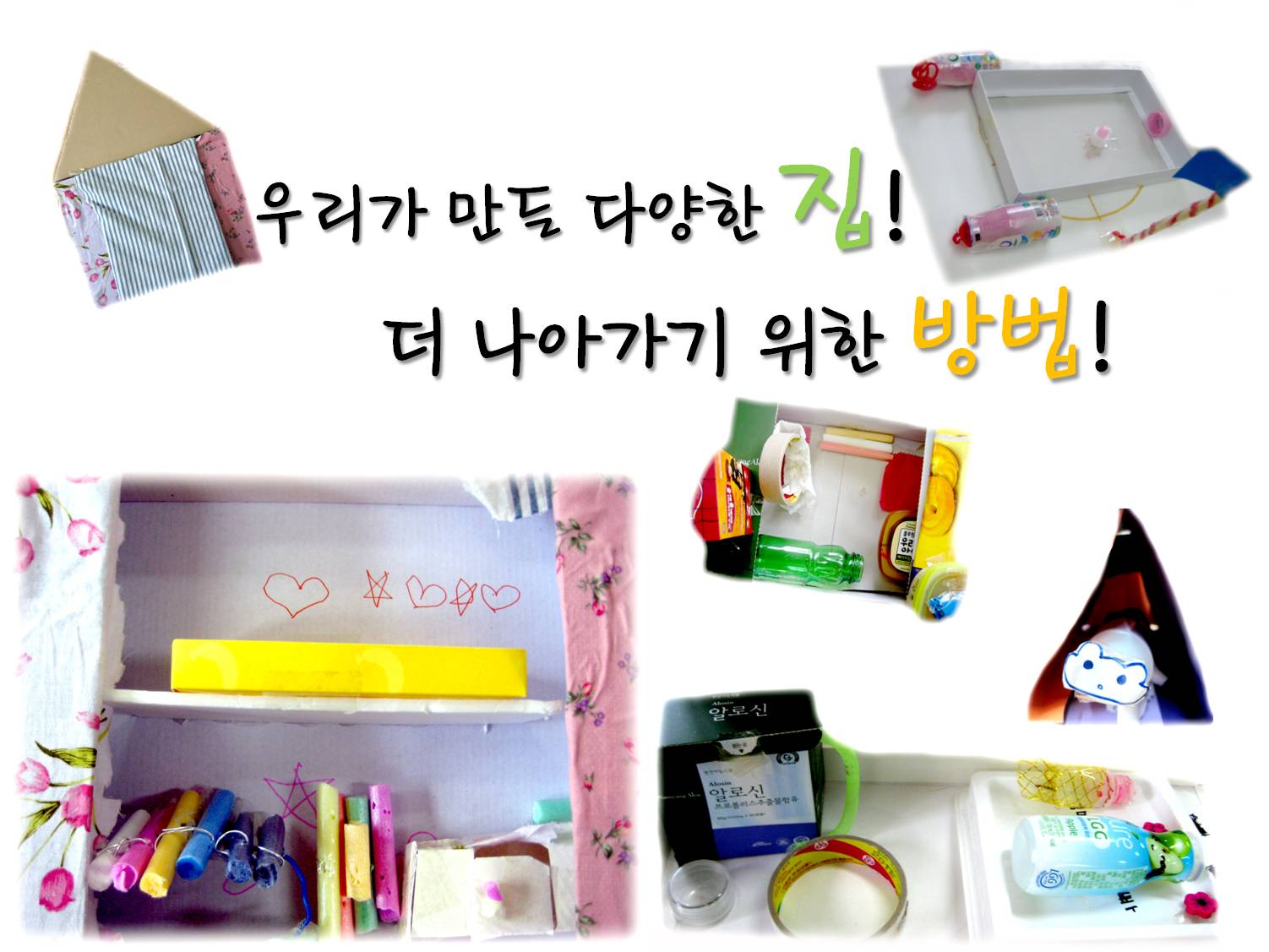 <집 만들기> 햇살반에서는 미니카, 동물 집, 내가 살고 싶은 집 만들기 활동이 전개되고 있습니다. 그러나 재활용품을 이용해서 표현하다 보니 집의 세부적인 구조나 특징들을 표현하는데 어려움이 있습니다. 어린이들의 활동을 지원하고자 집을 만드는 이유에 대해서 먼저 이야기를 나누어 보았습니다. “미니카를 보관하기 위해서 집이 필요해요. 집을 더 크고 넓게 만들면 더 많은 미니카를 보관할 수 있어요.” “미니카만 있으면 재미없으니까 집 안에 재미있는 것을 함께 만들어서 놀고 싶어요.” “큰 집이 있으면 내 미니카와 친구 미니카가 함께 살 수 있어서 좋을 것 같아요. 매일 만나서 신나게 놀 수 있잖아요.” “내가 살고 싶은 집을 만들고 싶어요. 인형이 집 안에서 노는 모습을 보면 내가 꼭 그 집에 살고 있는 것 같아서 기분이 좋을 것 같아요.”“혼자 사는 것 보다 여러 명이 살면 더 좋으니까 큰 집을 만들어서 많은 사람이 살 수 있도록 하고 싶어요.”