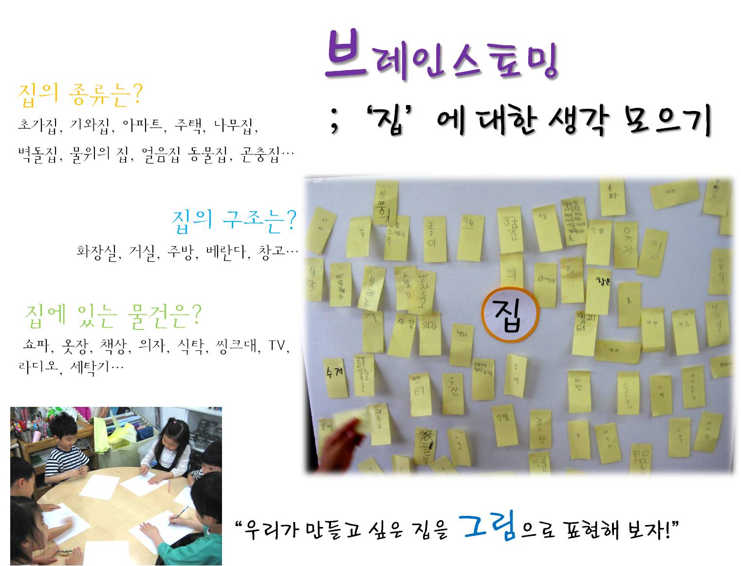 어린이들이 집에 관해 어떤 사전 경험과 지식을 갖고 있는지 알아보기 위해 <브레인스토밍>을 통해 “집” 하면 떠오르는 개념, 낱말들을 생각나는 대로 적어 보았습니다. 그리고 관련이 있는 낱말끼리 모아 봅니다. 집의 종류, 집의 공간, 집에 있는 물건 등으로 분류 되어진 다양한 개념들. 어린이들은 브레인스토밍을 통해 "집"에 관한 개념들을 확장시켜 나갈 수 있었습니다.