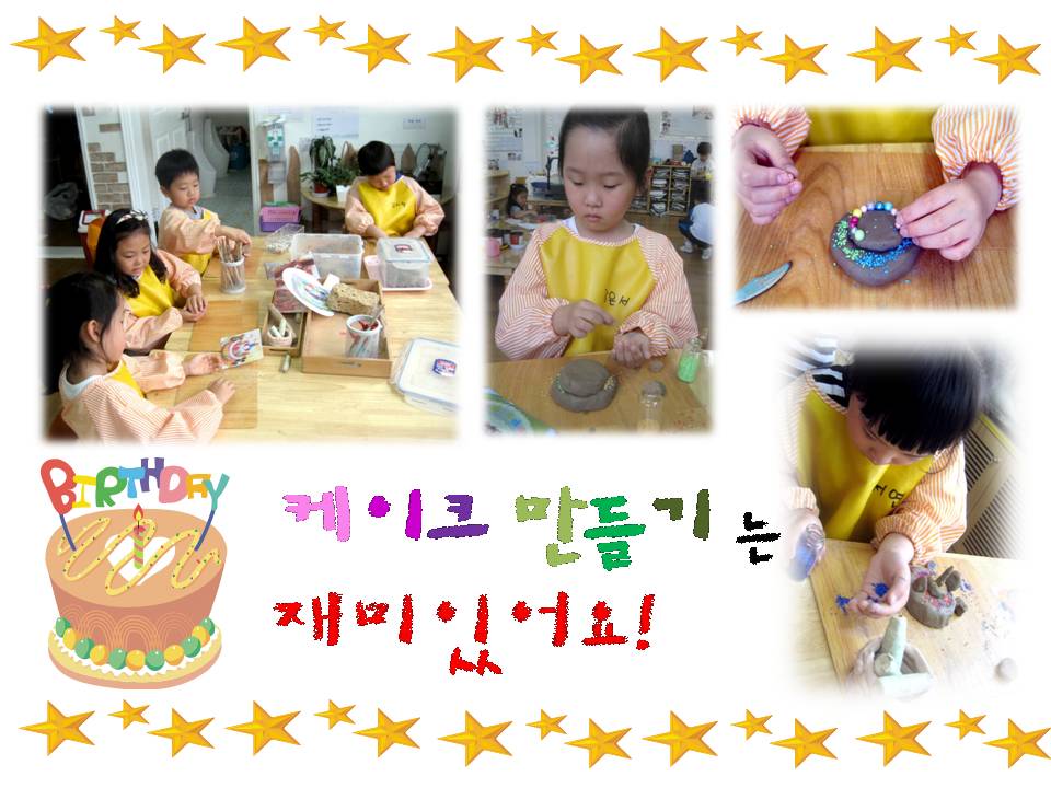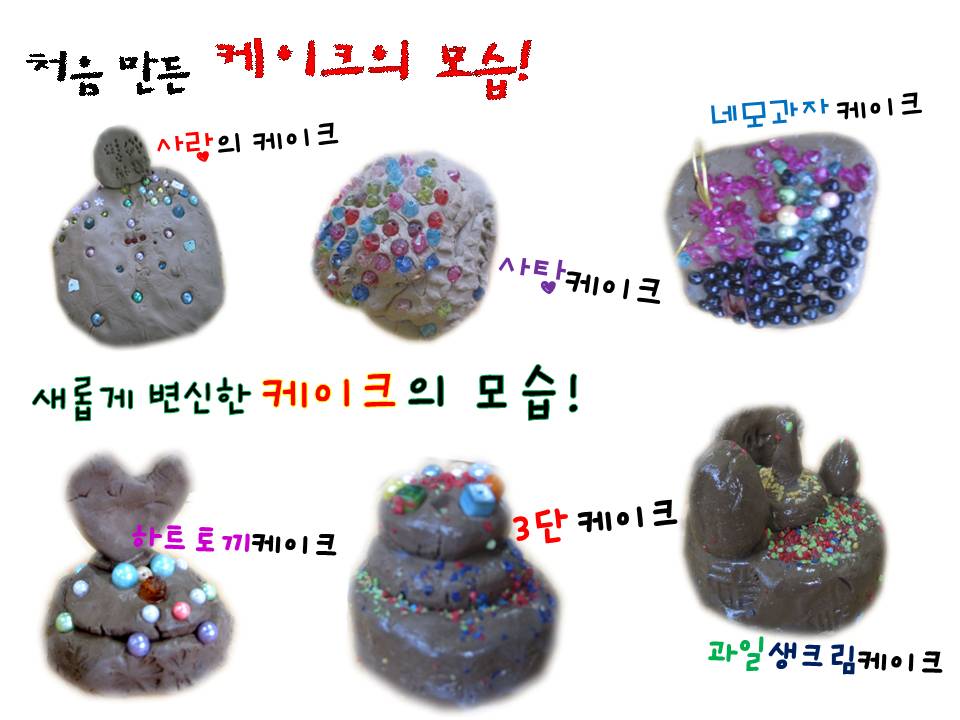 유아들의 막연함을 덜어주기 위해 다양한 케이크모양의 사진자료를 제시합니다. “난 네모케이크를 만들어야지” “나는 햇살반 친구들을 위한 케이크를 만들 거야” “나는 가족들과 파티 할 케이크를 만들 거야”친구들은 찰흙영역에서 시작된 케이크 만들기는 놀이시간 내내 맛있는 케이크 만들기로 이어집니다. 처음에는 1단 원형케이크만 만들었는데 다양한 사진자료를 참고하면서 여러 가지 모양의 케이크가 만들어지고 있답니다. 또, 더 예쁜 케이크를 만들기 위해 친구들은 다양한 매체를 사용하여 화려한 케이크를 완성합니다. “나는 하트 케이크를 만들었어. 케이크 위에 찰흙과 철사를 이용해서 하트를 만들어 꽂았어.” “난 2단 과일 케이크! 찰흙 두 개를 합체해야 더 케이크처럼 보이잖아. 과일처럼 보이려고 색깔 모래도 많이 뿌렸어” 어린이들은 자신들이 만든 케이크를 보며 점점 완성도를 높이고자 하는 욕구를 보이기 시작합니다.케이크 만들기에 점점 몰입하는 가운데 다음에는 어떤 디자인의 케이크가 완성될지 기대해주세요.