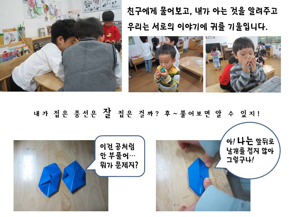 대화를 듣고 주변에서 풍선접기를 하고 싶은 친구들이 각자 색종이를 들고 모여듭니다. 유아1: 자, 세모를 접어. 그리고 또 이렇게 접어! 유아3: 이렇게? 맞아? 유아4: 좀 천천히 말해줘! 유아1: 빨리 해. 다음 펴서 다시 이렇게 접어! 유아6: 나는 모르겠다... 너꺼 접고, 내 것도 그냥 접어 줘! 유아3: 너는 내가 가르쳐 줄께! 유아7: 내꺼는 좀 이상한 것 같은데... 맞아?