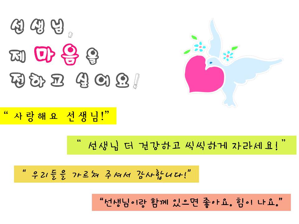 ‘스승의 날을 축하해요’ 외치며 한손엔 예쁜 카네이션 카드를 들고 교실 문을 씩씩하게 들어오는 친구들~ 저마다 얼굴엔 ‘이거 내가 만들었어요’라며 스스로에게 뿌듯해하며, ‘칭찬해 주세요’ 라는 표정을 머금고 있습니다~ 고맙다는 선생님의 말에 왠지 모를 뿌듯함에 어깨를 ‘으쓱’ 거리는 사랑스러운 어린이들~