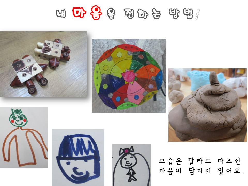 먼저 색종이 팀이 만들기를 끝내고 다가와 말을 합니다. ‘선생님 선물이에요~ 목도리를 만들었어요’ ‘나는 내 손가락을 그렸어요~ ‘나는 미니카 만들어 줄께요’ ‘나는 하트줄꺼예요’저마다 자신들이 제일 소중하게 생각하는 것들 만들어 선생님께 선물합니다.