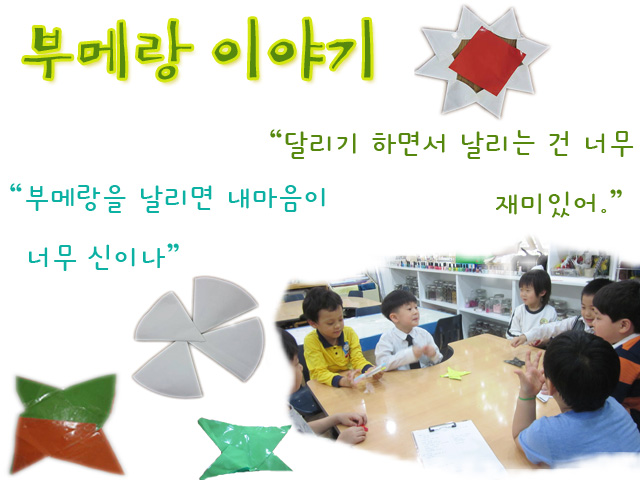 꽃잎반 친구들이 색종이를 이용하여 무언가를 열심히 만들기 시작합니다. 아이들은 이것을 만들고 <부메랑> 이라 이름 부르며 날리기를 시도합니다. “얘들아, 이거 날려보자.” 교실 안에서 색종이 접기로 시작된 놀이가 또 다른 놀이로 이어집니다. 그런데 아이들의 불만이 여기저기서 쏟아집니다. “선생님, 부메랑이 내 머리에 맞았어요.” “친구들이 나한테 부메랑 던졌어요.” 아이들에게 교실보다 넓은 강당의 공간을 제공해 주기로 합니다. “우와, 강당에서 날리니까 진짜 넓다.” “내 부메랑은 위로 올라갔어.” “내꺼는 하늘까지도 갔다~” “부메랑 놀이 하니까 진짜 재미있어.” “부메랑을 날릴 때는 너무 신이나~” 아이들이 만든 부메랑에 대해 조금 더 이야기를 나누어 봅니다.