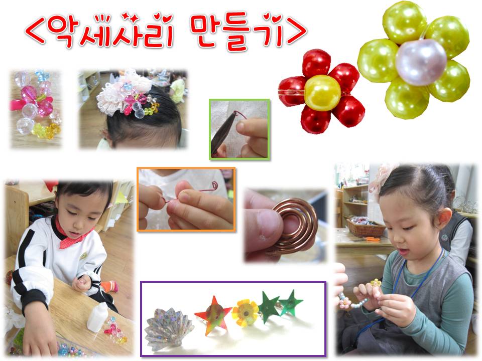 구슬영역에서 구슬과 철사를 사용하여 목걸이나 팔찌, 반지, 귀걸이 등 악세사리 만들기에 관심이 높아지고 있답니다. 이제는 크기가 작은 구슬 꿰기도 척척!! 내가 만들고 싶은 목걸이나 팔찌를 다양하게 만들어 봅니다. 목걸이와 팔찌 이외에 다양한 악세사리를 만들어 보는 경험을 위해, 악세사리를 만들 수 있는 재료를 조금 더 다양하게 제공하기로 합니다. “똑딱이 철사로 귀걸이를 만들 수 있겠다!” “실에 스팽글을 끼워볼까?” “브로치 만들 때 사용하는 핀도 있어!!” “철사에 구슬을 끼워서 모양을 만들어서 핀에 붙이면 예쁜 머리핀으로 변신도 할 수 있어!~”