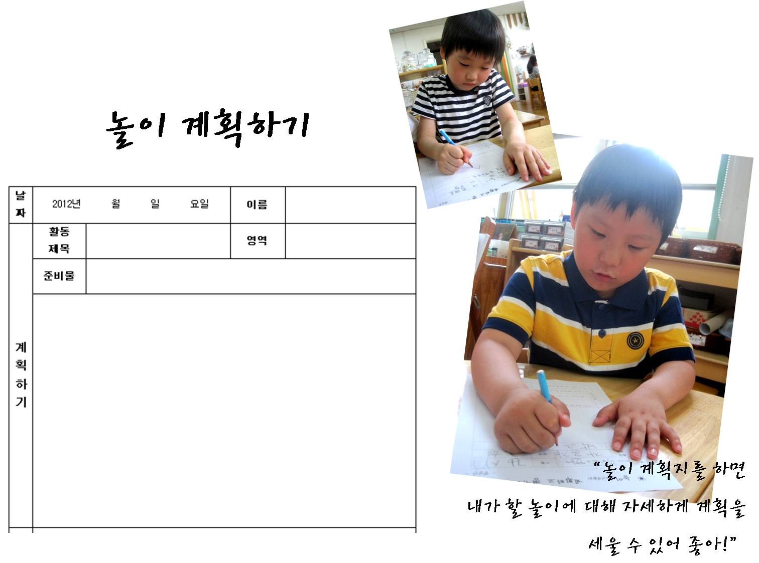 “계획지를 하니까 내가 어떤 놀이를 계획했는지 알 수 있어 좋은 것 같아요!” “내가 할 놀이를 미리 생각해 볼 수 있어 좋아요!” “놀이를 하기 전 필요한 준비물을 미리 생각하고 선생님께 도움을 요청할 수 있어 좋아요.”