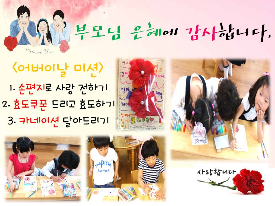 “어버이날은 무슨 날일까요?” “엄마,아빠에게 안마를 해주는 날이에요.”, 엄마,아빠를 기쁘게 해주는 날이에요.”,“부모님께 뽀뽀해주는 날이에요!” 어버이날의 의미를 되새기며 이야기 나누어봅니다. 낳으시고 길러주시며 한없는 사랑을 베풀어주신 부모님의 은혜에 보답하고자 부모님께 한 글자 한 글자 정성들여 감사하는 마음을 사랑의 편지에 담아봅니다. 또 직접 접어서 만든 예쁜 카네이션 브로치를 부모님께 멋지게 달아드립니다. 마지막으로 효도쿠폰! 부모님들께 잘 실천했나요?가정의 달 5월! 소중한 가족들과 멋진 추억을 많이 만드시길 바랍니다.