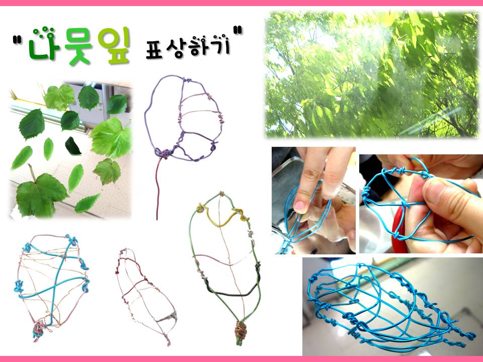 철사로 놀이하기를 경험하면서 우연히 하늘반 창가로 보이는 푸른 나뭇잎에 관심을 가지는 아이들.. “나뭇잎 색깔이 진짜 예쁘다~” “철사로 나뭇잎을 만들 수 있을까?~” “철사로 만든 나뭇잎은 영원히 보관할 수 있겠다~” “알록달록 예쁜 나뭇잎을 만들어 보자~” 철사로 나뭇잎을 만들기 위해 유치원 마당에 있는 다양한 나뭇잎을 수집합니다. 그리고 나뭇잎의 모양을 자세히 관찰해봅니다. “나뭇잎이 꼭 우리 손 모양 같아” “뾰족뾰족 가시처럼 생겼네~” “나뭇잎이 너무 매끄러워~” 나뭇잎 관찰을 통해 질감, 무게감, 색감, 향, 모양, 잎맥 등을 알수 있었답니다. 관찰한 나뭇잎을 철사로 만들어 보기에 도전합니다. 아이들이 만든 세상에 하나뿐인 나뭇잎은 어떤 모습일까요? 다양한 나뭇잎 표상하기! 다음 주를 기대해 주세요!