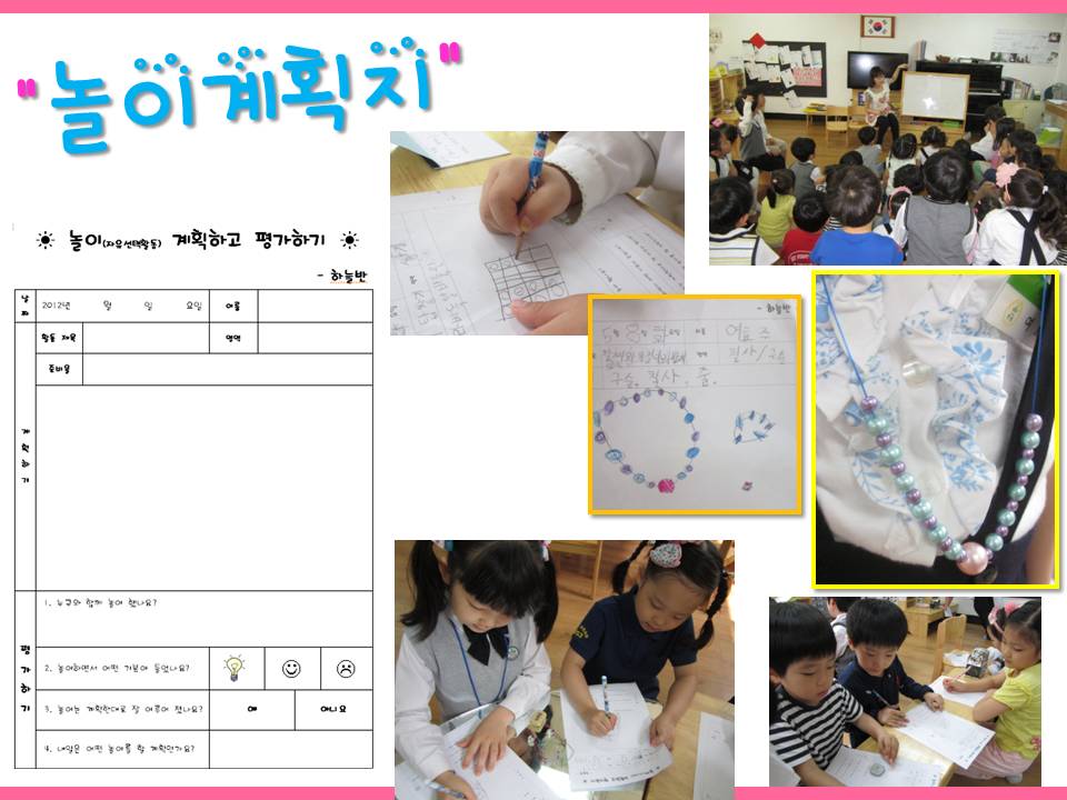 어느 영역에서 어떤 것을 만들지, 어떤 준비물이 필요한지 생각해보고 꼼꼼히 적어보는 아이들의 모습에서 진지함을 발견합니다. 놀이가 끝난 후 자신의 활동 사진을 평가지에 붙이고 나의 활동을 평가 해보며 자기 반성 뿐 아니라 내일의 또 다른 활동을 계획해 봅니다. 머릿속의 생각을 계획지에 표현하는 것들이 아직 서툴고 익숙하진 않지만, 글과 그림으로 계획지에 생각을 담아보는 활동을 통해 다양한 매체를 새로운 눈으로 바라보며 폭 넓게 많은 것들을 경험해보는 의미있는 놀이시간으로 채워나가길 기대해봅니다