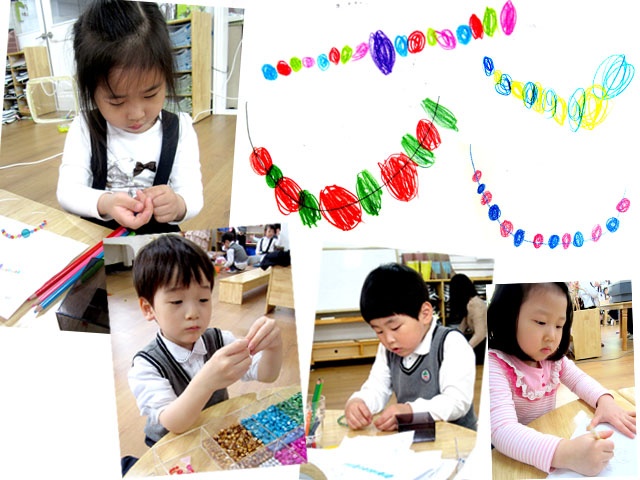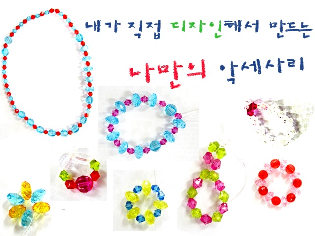 그냥 구슬을 꿰어 악세사리를 만드는 것 보다 패턴이 있는 악세사리를 만들었을 때의 악세사리가 어린이들이 보기에도 더 특별히 예쁘게 느껴지나 봅니다.