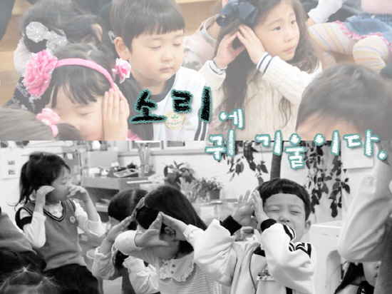 우리 주변에서 나는 여러 가지 소리들에 민감하게 반응하는 어린들이 좀 더 소리에 귀 기울일 수 있도록 새싹반에는 어떤 소리가 들리는지 이야기를 나누어 보았습니다.