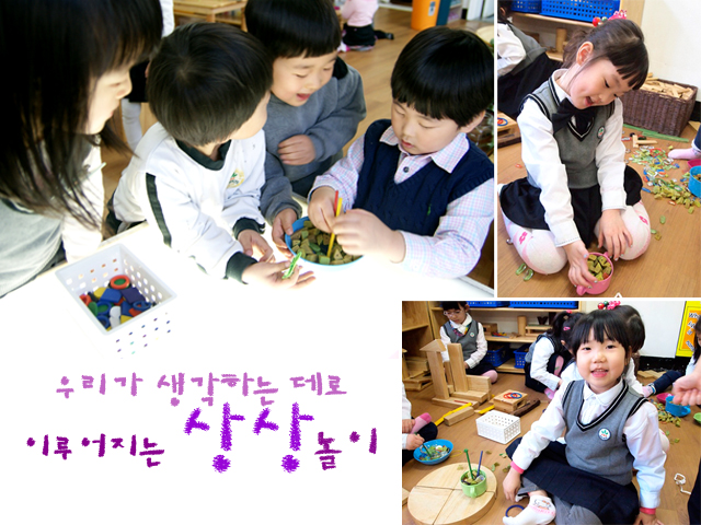 새싹반의 나무블록 영역에서는 어린이들의 역할놀이가 한창입니다. 초반에는 역할놀이를 할 수 있는 매체가 많지 않았지만 어린이들의 놀이를 관찰하던 교사는 그들이 나무블록으로 즐겨 하고자 하는 것이 역할놀이임을 파악하게 되고 이에 역할놀이를 확장시켜 줄 수 있는 매체를 지원하게 되었습니다. 매체의 지원이 있은 후 어린이들의 역할놀이는 좀 더 활력을 가진 듯합니다. “여보~! 우리 소풍가요~!” “잠깐만, 여기 애기랑 있어요. 내가 차 가져 올게.” “부우웅~~~ 애기야, 누나야, 언니! 다 타~소풍가자” “선생님! 우리 집에 놀러 오세요. 우리 집에서 맛있는 거 하고 기다릴게요!” “돼지고기 사세요!” “맛있는 스파게티 드세요~”