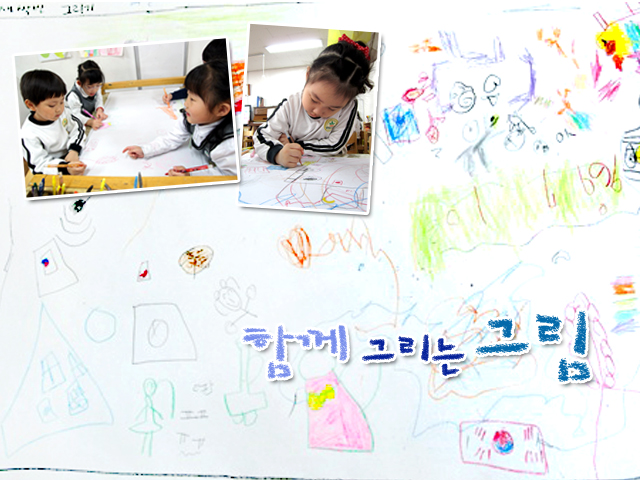 새싹반에는 커다란 종이에 그림을 그릴 수 있는 롤테이블이 있습니다. 매일 놀이를 하기 전 어린이들과 함께 “오늘은 무엇을 그릴까?”고민을 합니다. 함께 그리는 그림인 것을 알기 때문인지 어린이들은 혼자만 그릴 수 있는 그림(사람, 자동차, 꽃 등) 대신 많은 것이 속해있는 마을이나 새싹반을 주제로 선택하여 그 안에 있는 여러 가지들을 나누어 그립니다.