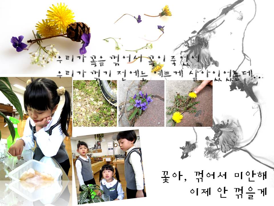 “새싹반에는 친구들도 있으니까 친구들도 그릴래.” “난 태극기도 그려야지~” “마을에 있는 자동차야. 너는 뭐 그려?” 함께 그려내는 어린이들의 커다란 이야기를 기대해 봅니다.★꽃이 시들었어요★