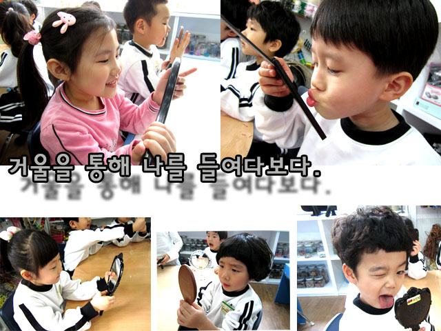 먼저 동화를 들은 후 일차적으로 거울을 보며 나의 얼굴을 탐색 해 봅니다. 어린이들은 거울에 비친 자신의 얼굴이 마냥 신기하기만 합니다. 이리보고 저리보고 눈썹도 움직여 보며 각 가지 표정들을 지어 봅니다.