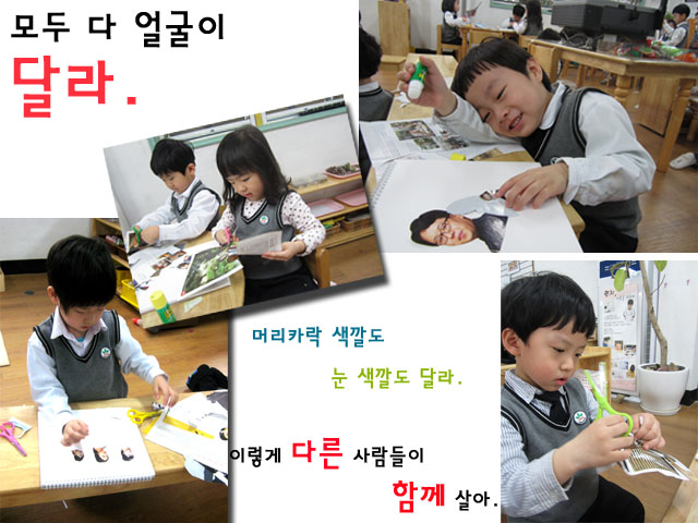 어린이들은 잡지 오리기 놀이 속에서 또 하나의 중요한 사실을 발견합니다. 모든 사람들의 얼굴은 다르고 다양하다는 것을.. 이 모든 사람들은 모두 함께 어울려 살아가고 있다는 것을 말입니다.
