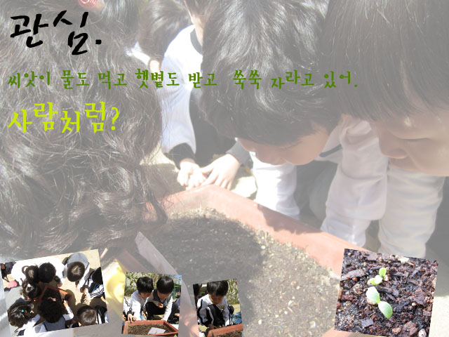 "지렁이가 싹이 올라올 수 있게 구멍을 내 줘서 그런 거야." 어린이들은 싹이 난 식물을 관찰하면서 <식물의 성장>에 대한 저마다의 생각을 펼쳐 냅니다.