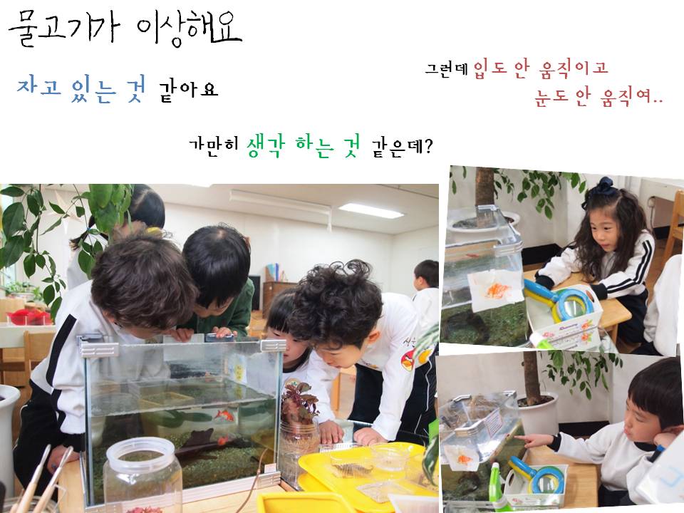 물고기를 보며 걱정스러운 마음으로 어항 앞에서 말을 건네는 어린이들의 목소리가 들립니다. 움직이지 않고, 입을 벌린 채 가만히 있는 물고기를 본 어린이들은 물고기가 죽었다고 생각한 모양입니다. 대그룹 시간, 어린이들과 함께 물고기의 죽음에 대해 이야기를 나누어 봅니다.