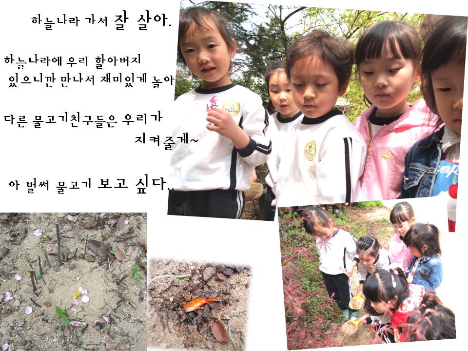 어린이들의 의견을 모아 우리는 움직이지 않게 된 물고기를 놀이터 옆 꽃밭의 꽃나무 옆에 묻기로 합니다.