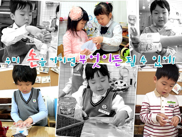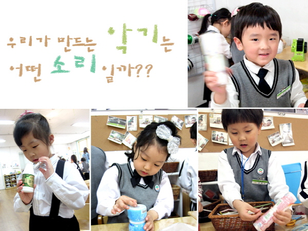 새싹반의 조형영역은 어린이들이 여러 생각들을 다양한 매체를 활용하여 그들의 손끝으로 생각을 표현하는 곳입니다. 우리가 늘 분리수거 할 때만 바라보던 재활용품들은 이곳에서는 주된 놀잇감이며 어린이들이 가장 좋아하는 재료입니다. 예를 들어 휴지심은 어린이들의 생각과 손을 거쳐 자동차의 바퀴가 되기도 하고 얼굴이 되기도 하며 무엇이든 변신할 수 있는 가능성을 지닌 놀잇감이 됩니다. 조형영역의 또 다른 매체들 역시 이와 같습니다. 교사는 어린이들이 이렇게 매체를 활용하는 것을 지지하고 격려합니다. 같은 사물을 다르게 바라보는 것이야말로 창의성의 가장 기본이 되는 것이기 때문입니다. 이러한 이유때문인지 어린이들은 조형영역을 좋아합니다. 내 손에서 무언가가 만들어 지는 것이 마냥 신기하고 즐거운 일로 여겨지나 봅니다. 단순히 매체를 사용하는 것을 좋아하던 어린이들의 작품 중 교사는 어린이들에게 흥미롭고 계속 질문할 거리가 있는 작품을 함께 알아보고자 합니다. 그것은 바로 <악기>입니다.