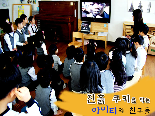 “마음이 좀 그렇다. 흙으로 만든 쿠키는 맛이 없을텐데.” “기분이 안 좋아요.” “기분이 엉망이예요. 우리는 음식을 남기는데 재들은 음식이 없어서 못 먹으니까요.” “우리는 부자라서..음식이 많아서..좋아요. 고마워요.” <우리가 달라져야 해요>