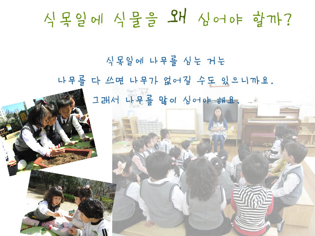4월5일 아침 아이들의 이야기 소리가 들립니다. “오늘 식목일이제?” “어. 나무심고 씨앗 심는 날이잖아.”식목일이니깐 식물을 심어야해! 라는 당위성만을 강조하기 보다는 왜 그렇게 해야 하는지에 대한 필요성을 알기 위해 함께 이야기 나누어 봅니다.