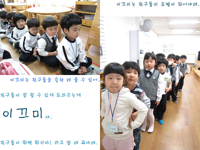"이끄미는 다른 친구들보다 더 멋지게 해야해요." "복도를 걸을 때도 걸어가야하고 친구들한테 뛰지 말라고 말 해 주어야해요." "그리고 친구들을 도와줘야해요." *이끄미가 하는 일* 1. 대그룹 시간에 아침인사와 날짜를 소개해요. 2. 도와주는 즐거움을 느껴요.(치약, 우유배식 등) 3. 다른친구를 칭찬해요(도와준 것 용기 있는 것) 4.우리 주변 친구들의 모범이 되어요.(정리하기 질서 지키기 인사하기)