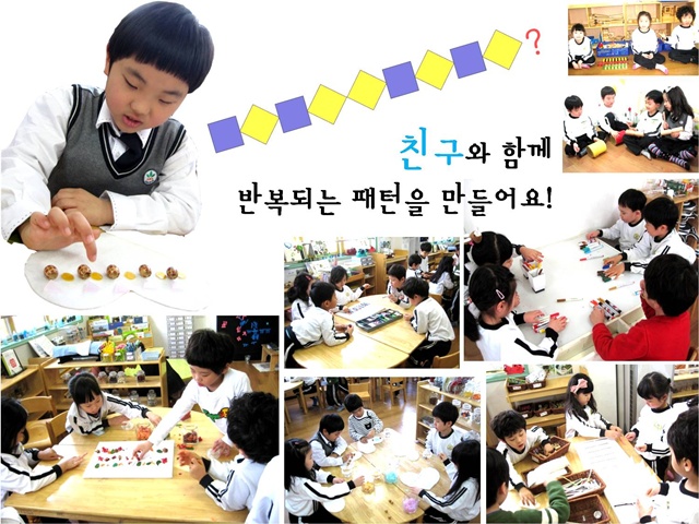 다양한 색과 모양의 반복되는 패턴을 보며 규칙성을 찾고, 다음 상황을 예측하며 사고를 확장해 나갑니다. 이와 연계하여 팀별로 서로 다른 재료를 이용하여 친구와 반복되는 패턴을 만들어 보았습니다. 어린이들은 다양한 매체를 활용하여 패턴을 만들어 봄으로써 여러 매체의 관계를 파악하고 관련된 특성을 찾아냅니다.
