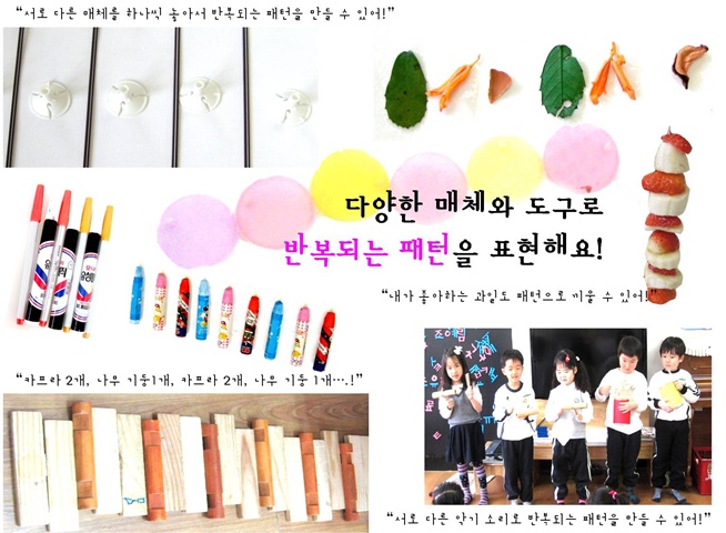“우리 팀은 크레파스 색깔을 반복되게 놓았어!”, "매직과 네임펜은 서로 다르니까 하나 하나 따로 놓아서 패턴을 만들었어.“, ”카프라 두 개, 기둥 블록 한 개 이렇게 반복되게 놓았어!“, ”악기로 쿵쿵쿵! 짝짝짝! 북과 우드블록을 3번씩 반복되게 쳤어!"
