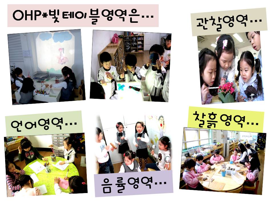 [OHP*빛테이블영역] OHP필름에 그림을 그려 OHP에 올려 이야기를 진행하는 그림자 극 놀이를 하기도 하고, 다양한 매체를 올려 모양을 구성하고 있어요.