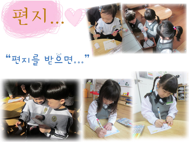“종이에 볼펜이랑 싸인펜이나 연필로 써서 친구한테 주는거야.” “옛날에는 전화가 없었으니까 편지를 쓰는 거야.” “편지는...한자로 편안한<편> 땅<지>에요.” “편지는 내가 쓰면 친구에게 받을 수 있어.”