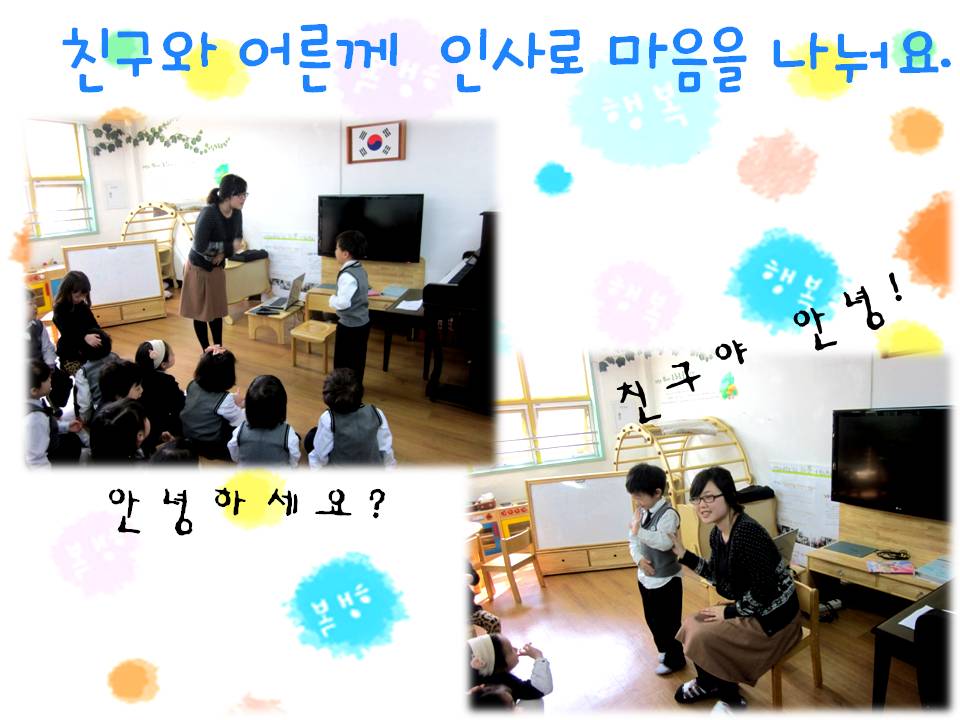 두 눈을 마주치고 친구와 어른들께 멋지게 인사하는 방법을 알아보고, 친구들과 함께 직접 인사도 해보았답니다. 이제 친구들은 교실에 들어서자마자 인사를 하기 위해서 주변을 둘러보기도 하고, 점차 함께 나누는 인사의 기쁨을 알아 갈 것입니다.
