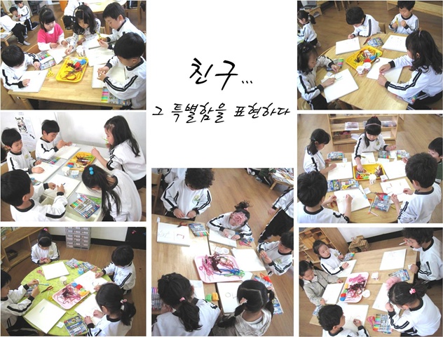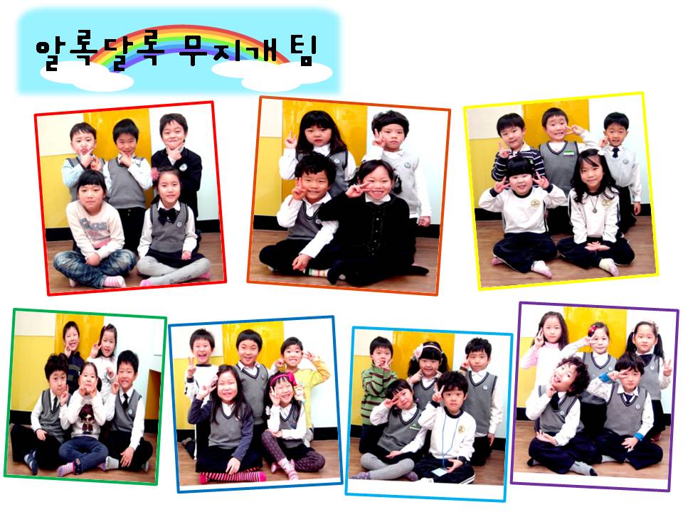 무지개 색 이름으로 나뉘어진 빨강, 주황, 노랑, 초록, 하늘, 파랑, 보라 7개의 팀! 어린이들은 팀 안에서 자신의 의견을 내세우기도 하고 친구들의 의견을 수용하며 의사소통 능력을 배워 나갈 것 입니다. 그 과정에서 한 사회의 구성원으로 익혀야 할 긍정적인 사회적 기술을 익혀 나가게 되겠죠? 앞으로 햇살반 7팀의 반짝거리는 활약이 기대됩니다.<우리 팀 친구의 이름을 표현해요>