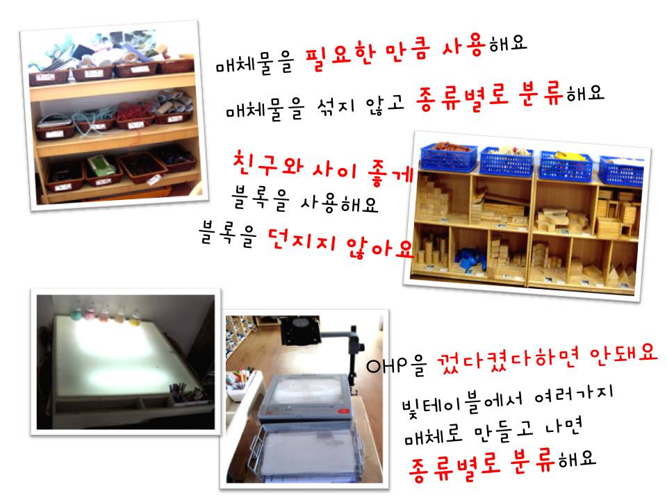 “미술영역에서는 물감을 사용하고 나서 뚜껑을 닫아놓아요” “조형영역에서는 매체물을 필요한 만큼만 사용해요.”