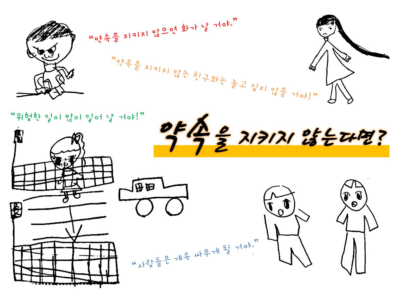 "약속을 지키지 않는다면 사람들끼리 서로 많이 싸우게 될 것 같아요.", "엄마 말씀을 듣지 않고 마음대로 행동해서 엄마가 화가 많이 나실 것 같아요.", "복도 약속을 지키지 않아서 친구와 지나가다가 부딪히게 될 것 같아요.", "빨간 불일 때 횡단보도를 건너가서 사고가 날 것 같아요.", "친구가 약속을 지키지 않는 모습에 화가나서 나도 그 친구랑 약속을 지키지 않아야 겠다고 생각할 것 같아요." 햇살반 친구들은 약속을 지키지 않아서 벌어질 상황들이 상상해 보며 <약속>은 우리가 함께 살아가는데 꼭 필요한 것임을 느낍니다.