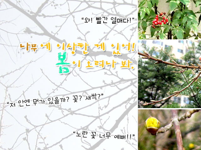 “여기도 노란 꽃이다!!” “우와~ 여기도 있어! 진짜로 꽃이 피었다!!” “예쁘다~” “원래 봄에는 꽃이 핀다! 이제 날씨 따뜻해서 봄이다 봄!” “맞다! 우리 엄마가 봄이라고 했다!” 노란 산수유는 봄이 성큼 다가왔음을 우리에게 알려줍니다.“어!! 나무에 이상한 거 있다!”