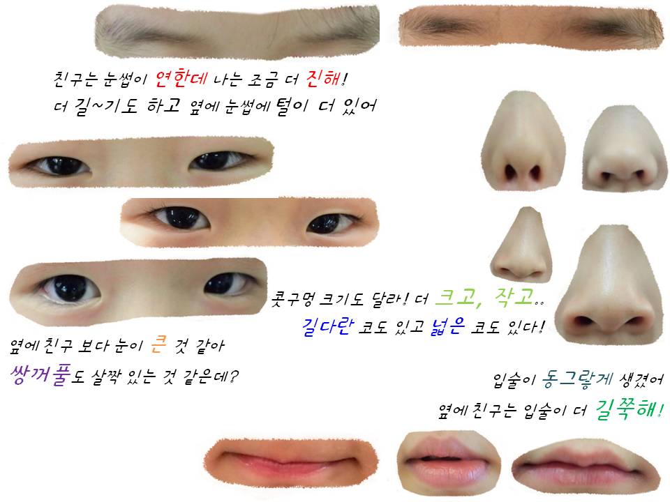 같은 얼굴, 손, 발, 몸, 머리가 있지만 조금씩은 다르게 생긴 친구들의 얼굴을 탐색해보았습니다.