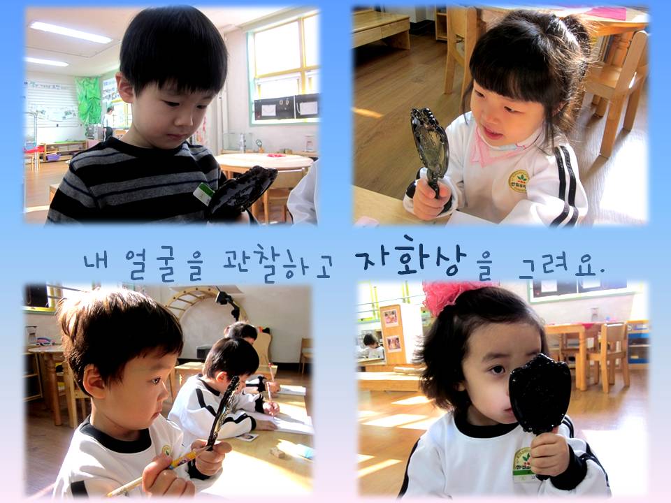 “식물도 배가 고프니까 물을 먹어야지.” “선생님 매일 물주면 안돼요.” “옛날에 꽃나무가 있었는데요. 일주일에 한번 줬어요.” 이전에 식물을 키워보았던 경험으로 꽃잎반 친구들과 함께 잘 가꾸기로 했답니다. 우리반에 있는 식물은 어떤 것을 좋아할까요? 친구들과 함께 조사해 봅니다.<자화상을 그렸어요!>