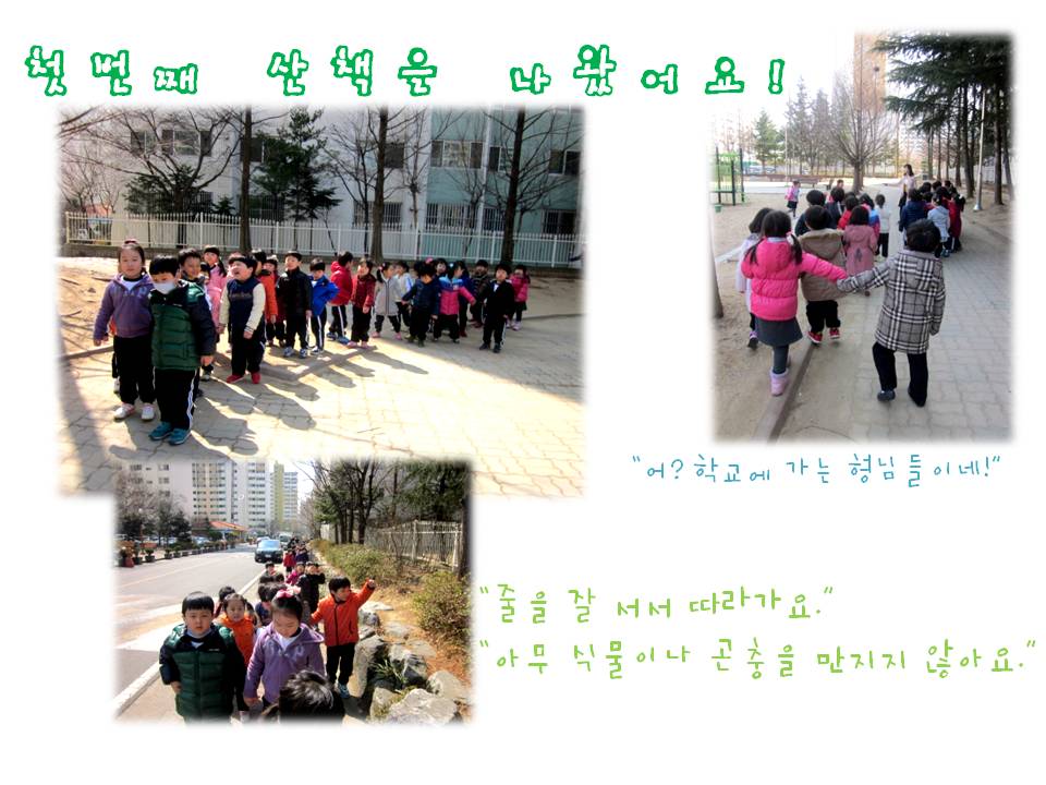 안전한 산책을 위해 규칙을 정하고, 짝꿍의 손을 꼭 잡고 교실을 나섰습니다.