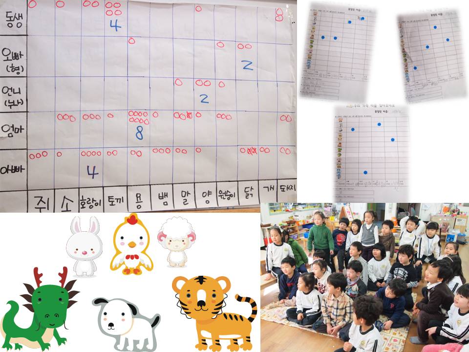 꽃잎반 친구들은 6살 개띠이며 아빠는 호랑이띠가 가장 많으며 엄마는 용띠, 언니(누나)는 양띠, 오빠(형)은 닭띠, 동생은 토끼띠가 많다는 것을 그래프를 통해 쉽게 알 수 있었답니다.# 스카프놀이